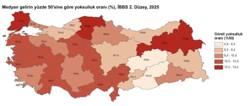 Göreli yoksulluk oranı en düşük olan İBBS 2. Düzey bölgeleri ise yüzde 4,6 ile TRC2 (Şanlıurfa, Diyarbakır), yüzde 6,3 ile TRB1 (Malatya, Elazığ, Bingöl, Tunceli) oldu.
