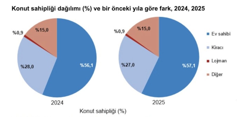 Oturulan konuta sahip olanların oranı geçen yıla göre 1,0 puan artarak 2025 yılında yüzde 57,1 olarak hesaplanırken, kirada oturanların oranı yüzde 27,0, lojmanda oturanların oranı yüzde 0,9, kendi konutunda oturmayıp kira ödemeyenlerin oranı ise yüzde 15,0 oldu.