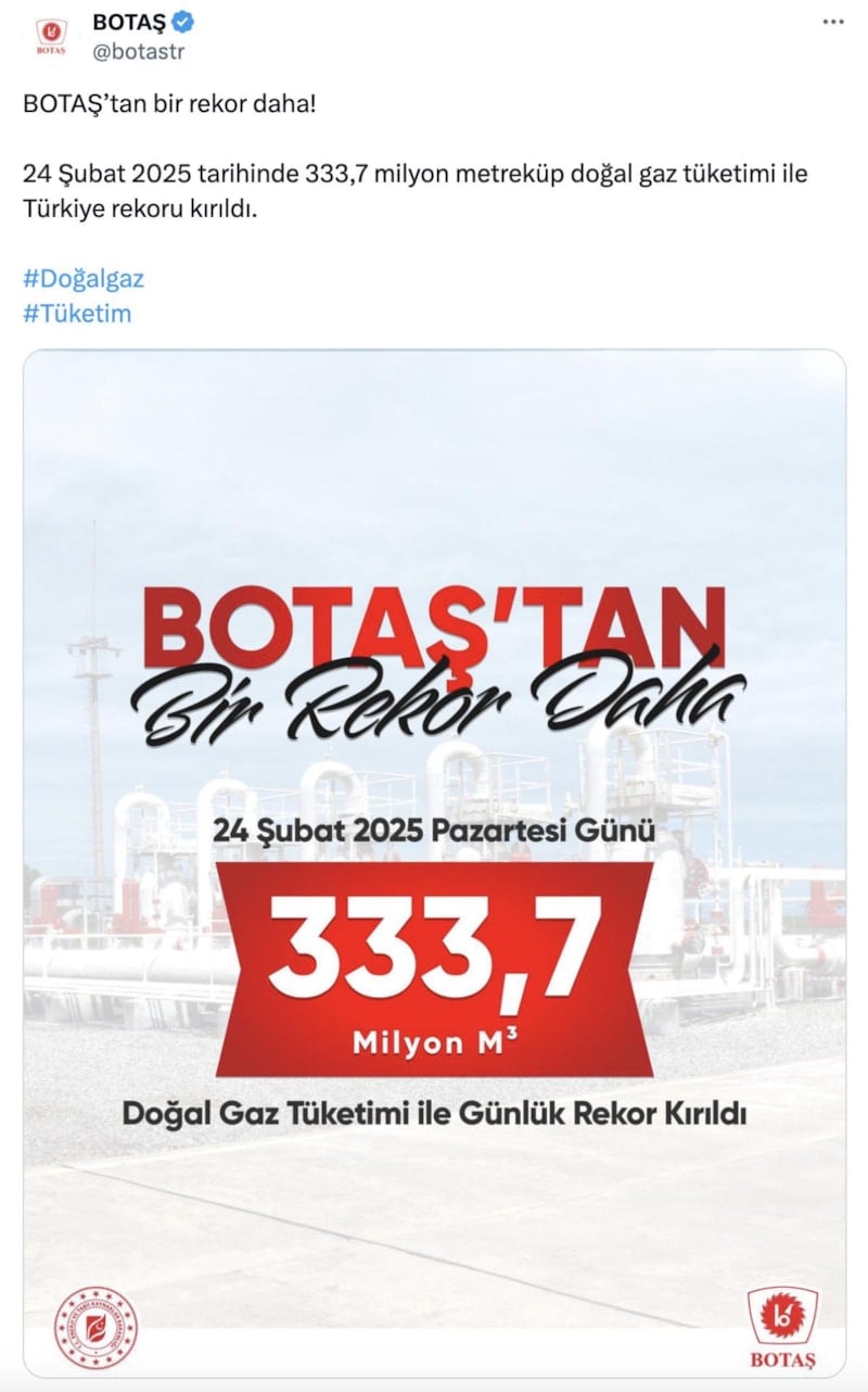Boru Hatları ile Petrol Taşıma AŞ'nin (BOTAŞ) X hesabından yapılan paylaşımda, "BOTAŞ'tan bir rekor daha. 24 Şubat 2025 tarihinde 333,7 milyon metreküp doğalgaz tüketimiyle Türkiye rekoru kırıldı." ifadelerine yer verildi.