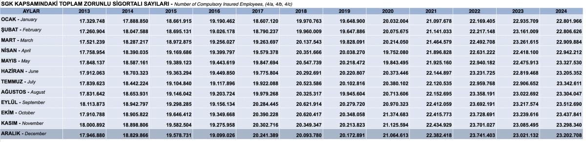 Bu sayıya çıraklar, muhtarlar, stajyer ve kursiyerler, tarımda kendi adına sigortalılar ve yurt dışı topluluk çalışanları da dahil.