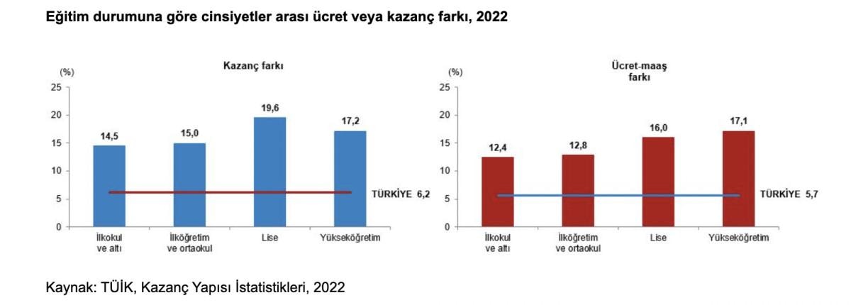 TÜİK verilerine göre geçen yıl cinsiyetler arası ücret veya kazanç farkı, tüm eğitim düzeylerinde erkek lehine gerçekleşti.