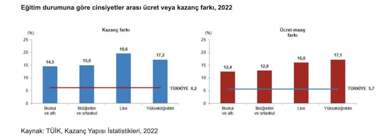 Kazanç Yapısı İstatistiklerine göre, yıllık ortalama brüt ücret-maaş ile hesaplanan gösterge için en yüksek fark yüzde 17,1 ile yükseköğretim mezunlarında yaşanıyor.