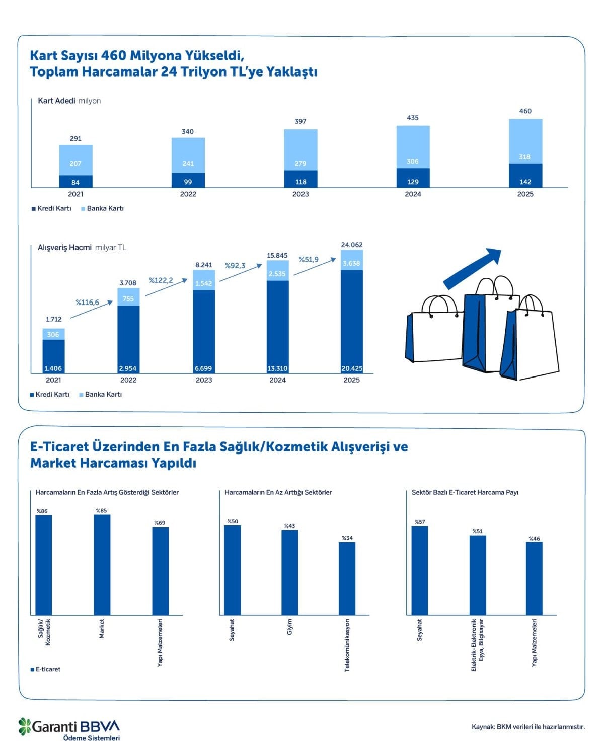 2025 yılı sonu itibarıyla Türkiye’de banka ve kredi kartı sayısı bir önceki yıla göre yüzde 5,8 artarak 460 milyona ulaştı. Bunun 142 milyonunu kredi kartları, 318 milyonunu ise banka kartları oluşturdu. Banka ve kredi kartlarıyla yapılan toplam alışveriş hacmi yüzde 51,9 artışla 24 trilyon 62 milyar TL’ye yükseldi. Harcamaların 20 trilyon 425 milyar TL’si kredi kartlarıyla, 3 trilyon 638 milyar TL’si ise banka kartlarıyla gerçekleştirildi.