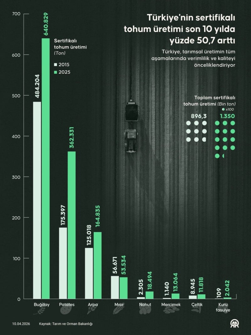 Sertifikalı arpa tohumu üretimi, 2015 yılında Türkiye'de 125 bin 18 ton seviyesindeyken, 2025 yılında yüzde 31,8 artarak 164 bin 835 tona yükseldi.