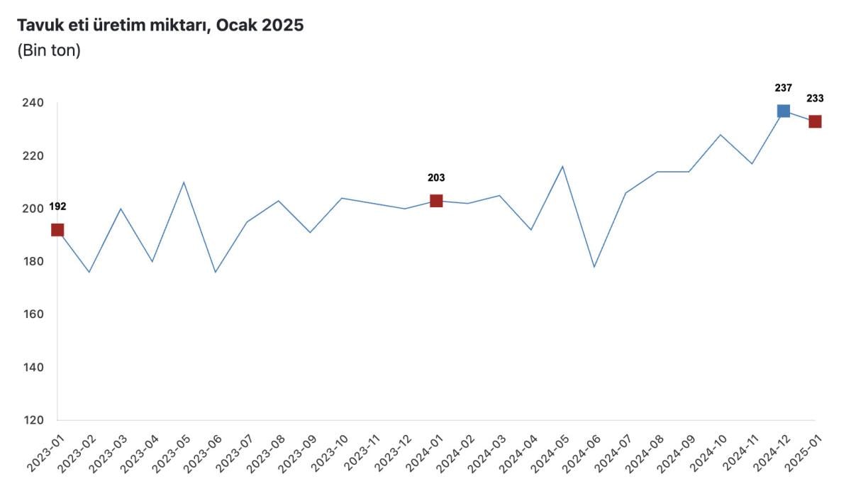 Buna göre, ocakta 233 bin 223 ton tavuk eti üretildi. Bu üretim, geçen yılın ocak ayına kıyasla yüzde 14,9 artarken bir önceki aya göre yüzde 1,7 azaldı.