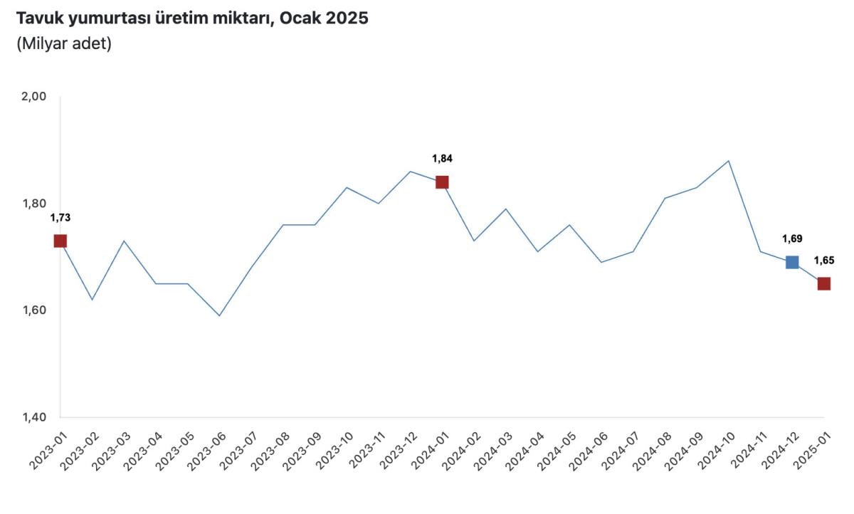 Tavuk yumurtası üretimi, ocakta aylık bazda yüzde 2,1, geçen yılın aynı ayına göre yüzde 10,1 geriledi. Bu dönemde 1 milyar 652 milyon 615 bin tavuk yumurtası üretildi.