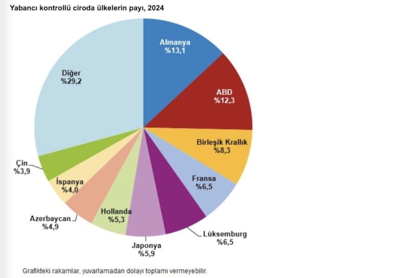 Yabancı kontrollü 11 bin 86 girişimden, 1309'u Almanya tarafından kontrol edildi. Bu girişimlerin 2024'te elde ettiği cironun toplam yabancı kontrollü cirodaki payı, yüzde 13,1 olarak hesaplandı.