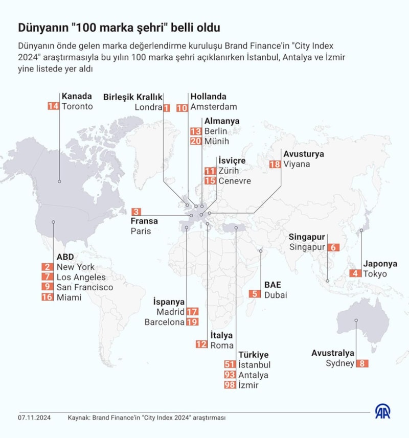 Brand Finance'in "City Index 2024" araştırmasıyla bu yılın 100 marka şehri açıklandı. Yayınlanan listede Londra ilk sırada yer alırken; İstanbul, Antalya ve İzmir yine listede bulundu.