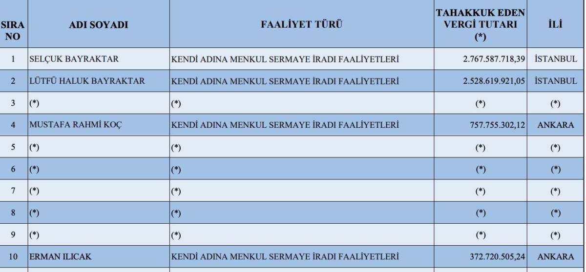 Üçüncü sıradaki isim açıklanmazken, dördüncü sırada 157 milyon lira ile Rahmi Koç yer aldı.