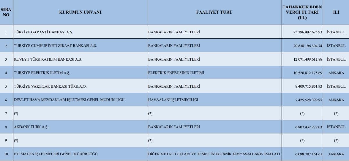 2024 yılına ilişkin vergileme döneminde en fazla kurumlar vergisi beyan eden mükellefler listesinde de 25 milyar 296 milyon 492 bin lira vergi tahakkuku ile Garanti Bankası birinci oldu.