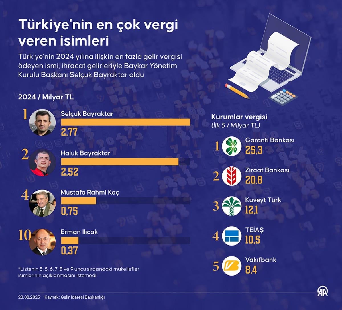 Buna göre, Türkiye'nin en fazla gelir vergisi veren mükellefleri listesinde ilk iki sırayı teknoloji firması Baykar'ın yöneticileri paylaştı.