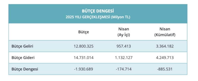 2025 yılı Ocak-Nisan döneminde merkezi yönetim bütçe giderleri 4 trilyon 249,7 milyar TL, bütçe gelirleri 3 trilyon 364,2 milyar TL ve bütçe açığı 885,5 milyar TL olarak gerçekleşti.