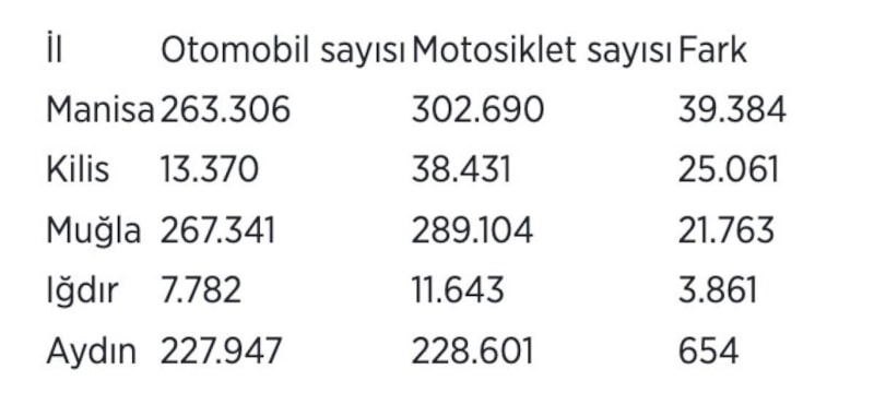 Motosiklet sayısı Aydın, Kilis, Manisa, Muğla ve Iğdır'da ise otomobil sayısını geçti. Kilis'te 13 bin 370 otomobil bulunurken, 38 bin 431 motosikletin kayıtlı olduğu belirlendi.