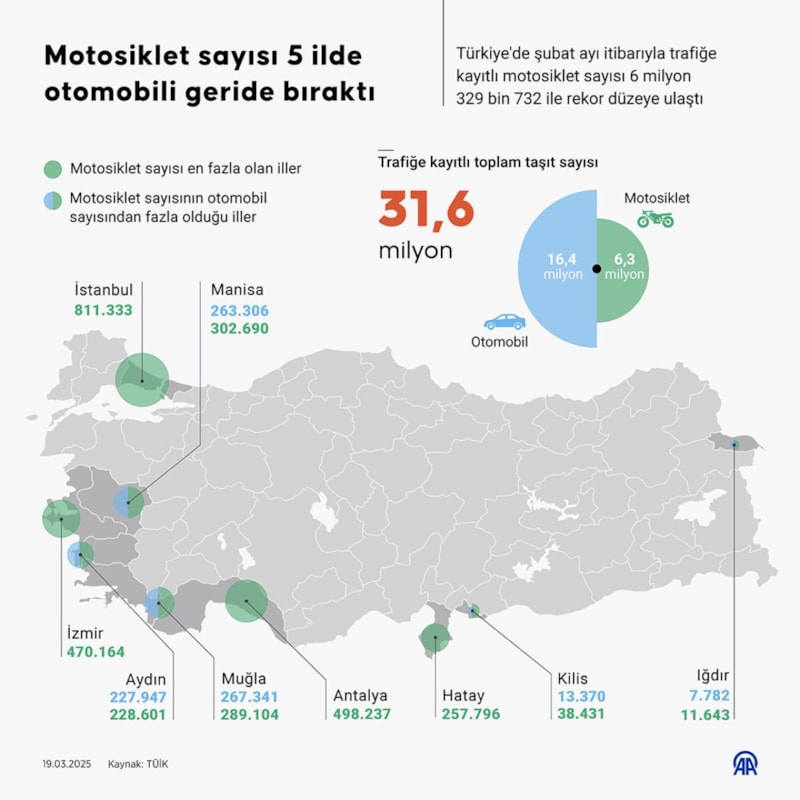Türkiye'de şubat ayı itibarıyla 6 milyon 329 bin 732 ile rekor düzeye ulaşan trafiğe kayıtlı motosiklet sayısı Aydın, Kilis, Manisa, Muğla ve Iğdır'da otomobil sayısını geçti.