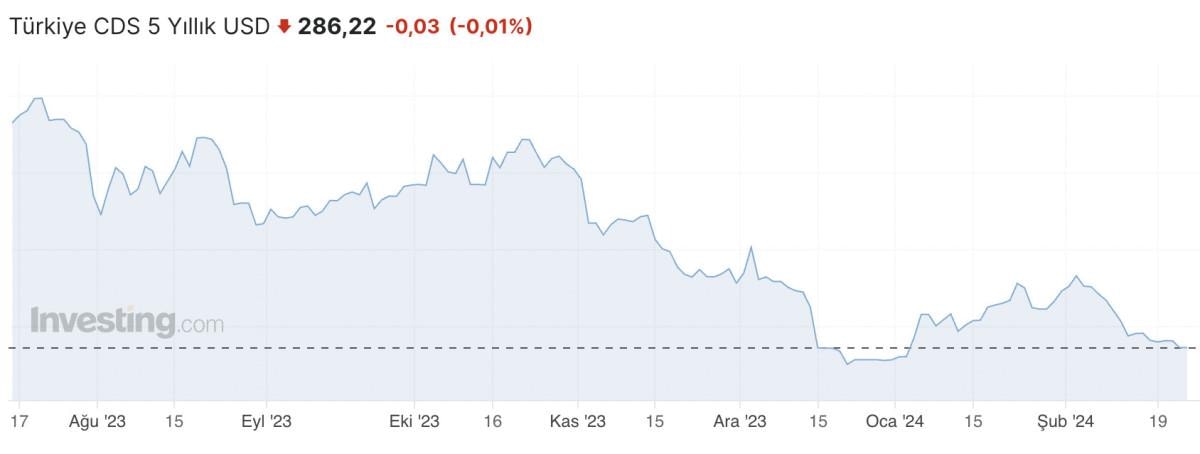 Düşüş eğilimini sürdüren Türkiye'nin 5 yıllık kredi risk primi (CDS) de 284 baz puana indi.