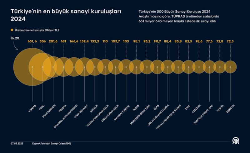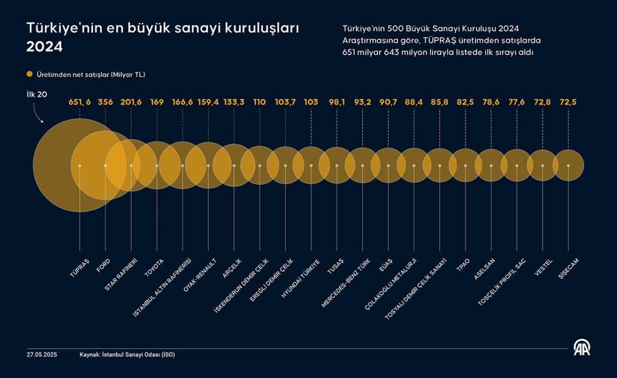 İstanbul Sanayi Odası'nın (İSO) "Türkiye'nin 500 Büyük Sanayi Kuruluşu 2024 Araştırması"na göre; TÜPRAŞ, üretimden satışlarda 651,6 milyar lirayla en büyük sanayi kuruluşu oldu.