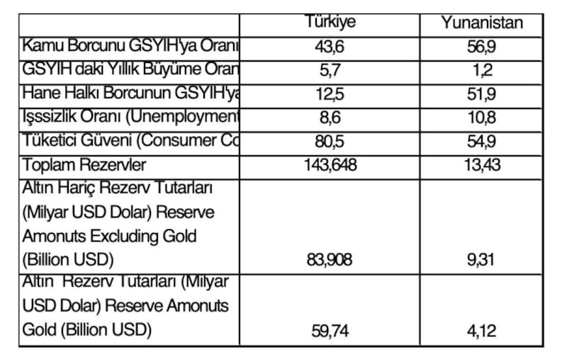 Türkiye TCMB Rezervleri, Kamu Borcunu GSYİH'ye Oranı yüzde, GSYİH'deki Yıllık Büyüme Oranı Yıllık, Hane Halkı Borcunun GSYİH'ye Oranı yüzde İşsizlik Oranı yüzde, Tüketici Güveni, Altın Rezerv Tutarı gibi bir çok unsurda “borç ödeme kabiliyetini ölçme amacı doğrultusunda” Yunanistan’dan çok daha iyi durumdadır.