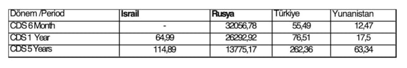 İsrail’in ham madde kaynakları yoktur. İsrail de savaş ortamındadır. Fakat 1 yıllık CDS puanı 64,99, 5 Yıllık CDS puanı 114,89‘dur. Savaş ortamındaki bir ülkenin verileri Türkiye verilerinden daha olumlu olabilmektedir.