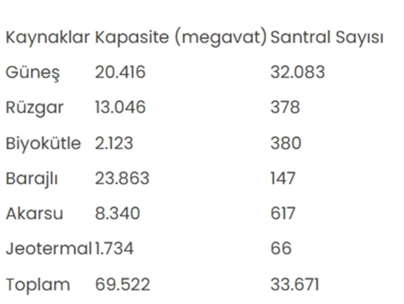 Yenilenebilir enerji kaynakları kapasite ve santral sayısı ise şöyle: