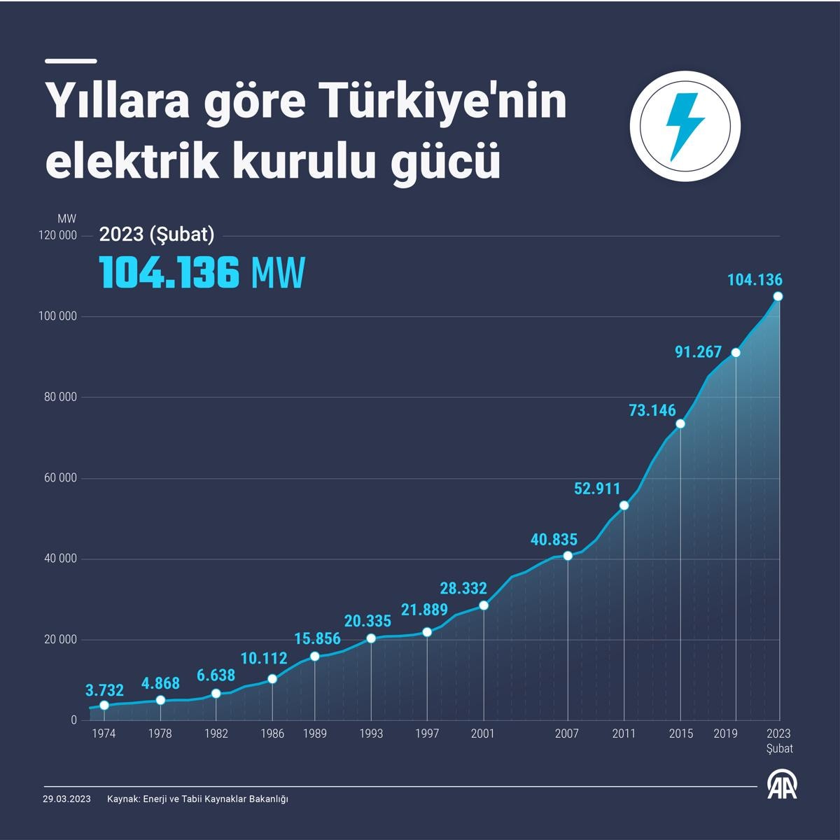 Bugün paylaşılan grafiği göre de 1975'te 3 bin 732 megavat kurulu gücün 104 bin megavata ulaştığı görülüyor.
