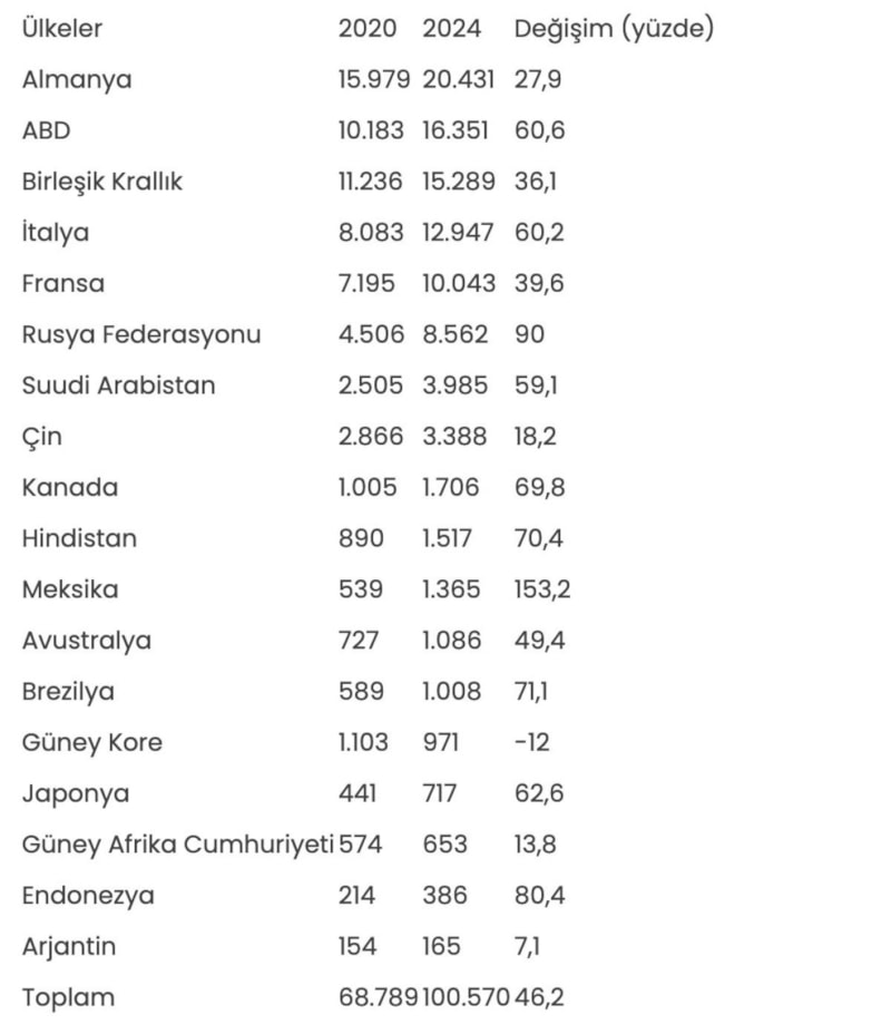Türkiye'nin 2020 ve 2024 yıllarında söz konusu ülkelere gerçekleştirdiği ihracat (milyon dolar) ve değişim (yüzde) verileri şöyle: