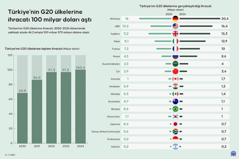 Türkiye, G20 üyesi ülkelere ihracatını 2020-2024 döneminde yüzde 46,2 artırdı. G20 Liderler Zirvesi, yarın Johannesburg'da başlayacak ve bu etkinlikte kurulacak temasların ikili ticareti hareketlendirmesi bekleniyor.