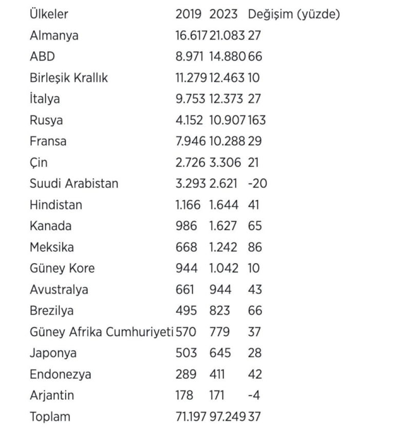 Türkiye'nin 2019 ve 2023 yıllarında söz konusu ülkelere gerçekleştirdiği ihracat (milyon dolar) ve değişim (yüzde) verileri şöyle: