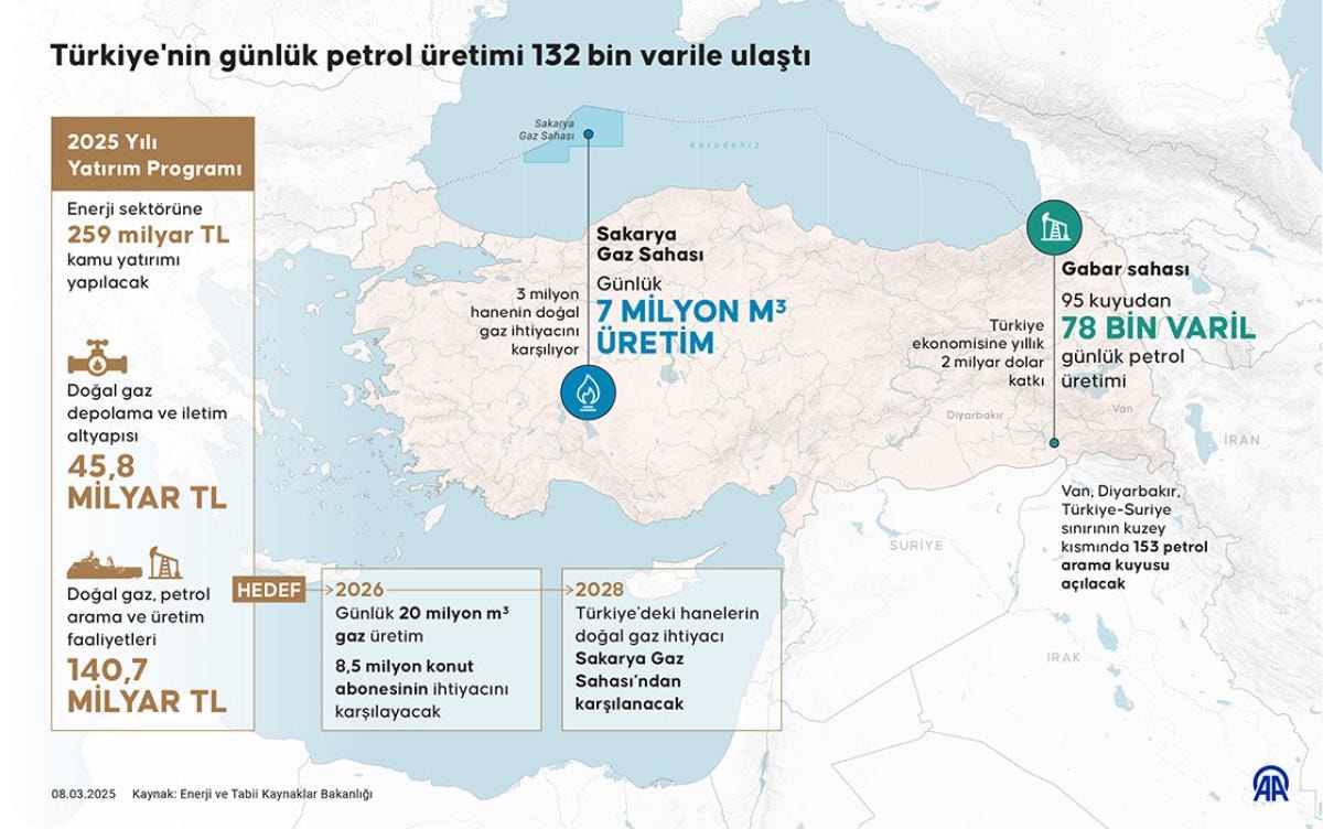 Güneydoğu ve Doğu Anadolu bölgelerindeki petrol arama kuyu sayısının yıl sonuna kadar 153'e çıkacağını kaydeden Bayraktar, "Mevcut durumda Türkiye'nin günlük petrol üretimi 2025 mart başı itibarıyla toplam 132 bin varile ulaştı." ifadesini kullandı.