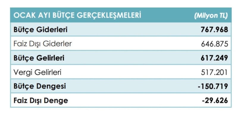 Merkezi yönetim bütçesi gelir ve giderleri aktarıldı ve bütçe dengesinin ocak ayında 150,7 milyar TL açık verdiği belirlendi.