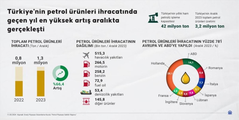 Türkiye, 2023'te petrol ürünlerinde en fazla ihracatı yüzde 66'lık artışla aralıkta gerçekleştirdi.