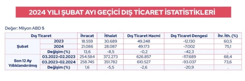 İkisinin dengesinde ise dış ticaret açığımız ocak ayında yüzde 48 azalmıştı, 6,2 milyar dolara gerilemişti. Şubat ayında yüzde 42,3 azaldı ve 7 milyar dolara geriledi. Bu da sevindirici bir rakam. İhracatın ithalatı karşılama oranı da tam 14,6 puan artışla yüzde 75,1'e yükseldi.