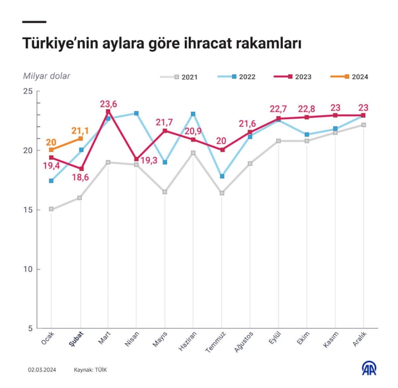 Şubat ayında aylık ihracat yüzde 13, 6 artışla 21 milyar 86 milyon dolar ve yıllık ihracat ise yüzde 1,6 artarak 258 milyar 745 milyon dolar oldu.