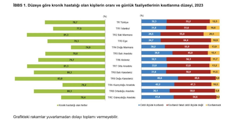 Kronik hastalığı olan 65 ve daha yukarı yaştaki kişiler İBBS 1. Düzeye göre incelendiğinde, kronik hastalığı olan kişilerin oranının en fazla olduğu bölgenin yüzde 83 ile Doğu Karadeniz Bölgesi olduğu görüldü. Bu bölgede kronik hastalığının günlük faaliyetlerini ciddi ölçüde kısıtladığını belirtenlerin oranı ise yüzde 46,6 oldu. Kronik hastalığı olan kişilerin oranının en az olduğu bölgenin yüzde 74,9 ile Doğu Marmara Bölgesi olduğu görüldü. Bu bölgede kronik hastalığının günlük faaliyetlerini ciddi ölçüde kısıtladığını belirtenlerin oranı ise yüzde 30,2 oldu.