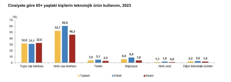 -Akıllı cep telefonu kullanan 65+ yaştaki kişilerin oranı yüzde 52,7 oldu.