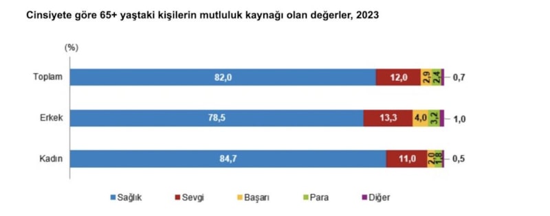 -Mutluluk kaynağı olarak sağlık 65+ yaştaki kişiler için yüzde 82,0 ile ilk sırada yer aldı.