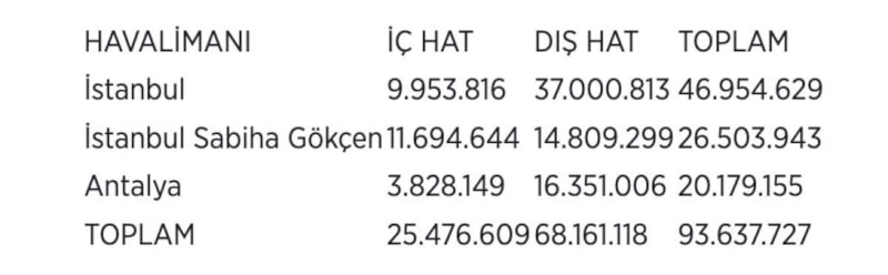 İstanbul, İstanbul Sabiha Gökçen ve Antalya havalimanlarındaki yolcu sayısı bu dönemde 93,6 milyon oldu.