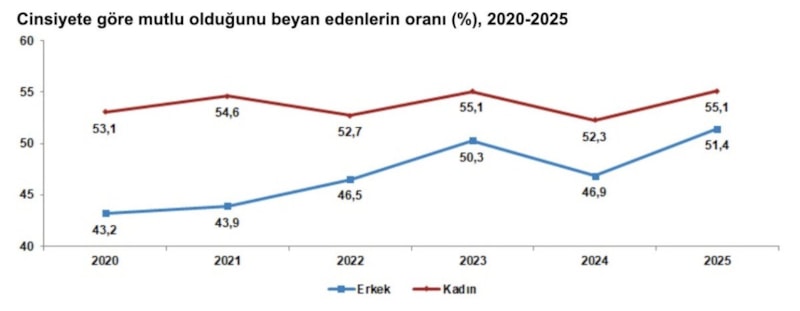 Mutlu olduğunu beyan eden erkeklerin oranı, 2024 yılında yüzde 46,9 iken 2025 yılında yüzde 51,4 oldu. Kadınlarda ise bu oran, 2024 yılında yüzde 52,3 iken 2025 yılında yüzde 55,1 oldu.