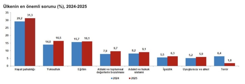 Ülkenin en önemli sorunu incelendiğinde; 2025 yılında hayat pahalılığı yüzde 31,3 ile ilk sırada yer alırken yüzde 16,5 ile yoksulluk ikinci sırada ve yüzde 16,1 ile eğitim üçüncü sırada yer aldı.