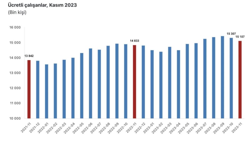 Ücretli çalışan sayısı bir önceki yılın aynı ayında 14 milyon 833 bin 144 kişi iken, 2023 yılı Kasım ayında 15 milyon 106 bin 556 kişi oldu.