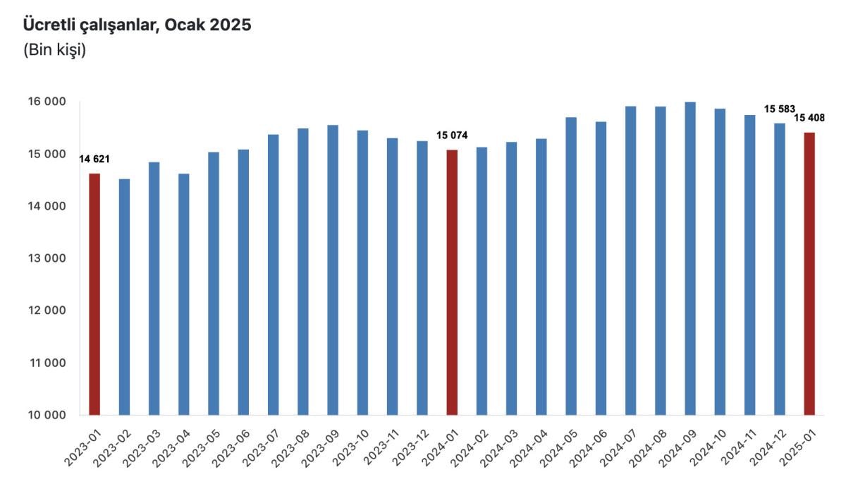 Buna göre, 2024 Ocak'ta 15 milyon 73 bin 564 kişi olan sanayi, inşaat ve ticaret-hizmet sektörleri toplamında ücretli çalışan sayısı, geçen yılın aynı döneminde yüzde 2,2 artışla 15 milyon 407 bin 625 kişiye yükseldi.