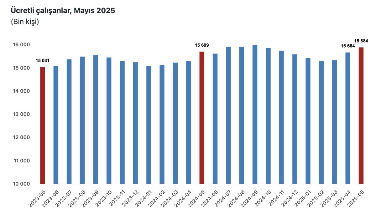 Ücretli çalışan sayısı bir önceki yılın aynı ayında 15 milyon 698 bin 674 kişi iken, 2025 yılı Mayıs ayında 15 milyon 883 bin 683 kişi oldu.