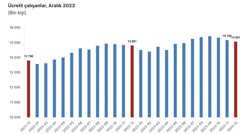 Ücretli çalışan sayısı bir önceki yılın aynı ayında 14 milyon 800 bin 999 kişi iken, 2023 yılı aralık ayında 15 milyon 57 bin 373 kişi oldu.