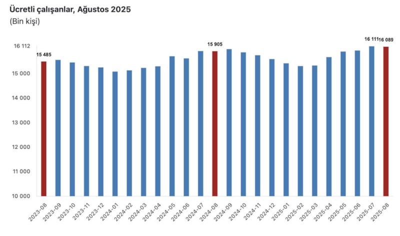Ücretli çalışan sayısı bir önceki yılın aynı ayında 15 milyon 904 bin 602 kişi iken, 2025 yılı Ağustos ayında 16 milyon 89 bin 450 kişi oldu.