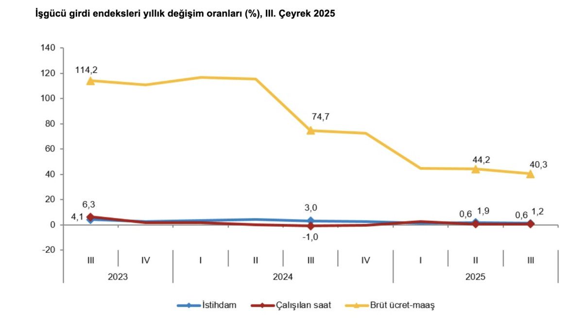 Sanayi, inşaat ve ticaret-hizmet sektörleri toplamında brüt ücret-maaş endeksi 2025 yılı III. çeyreğinde, bir önceki yılın aynı çeyreğine göre yüzde 40,3 arttı. Alt sektörler incelendiğinde, endeks; sanayi sektöründe yüzde 34,5, inşaat sektöründe yüzde 44,4 ve ticaret-hizmet sektörlerinde yüzde 43,5 arttı.