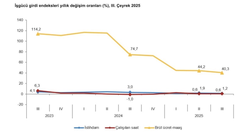 TÜİK'in yayamladığı İşgücü Girdi Endeksleri'ne göre yılın üçüncü çeyreğinde çalışılan saat endeksi yıllık yüzde 0,6 ve brüt ücret-maaş endeksi yıllık yüzde 40,3 arttı.