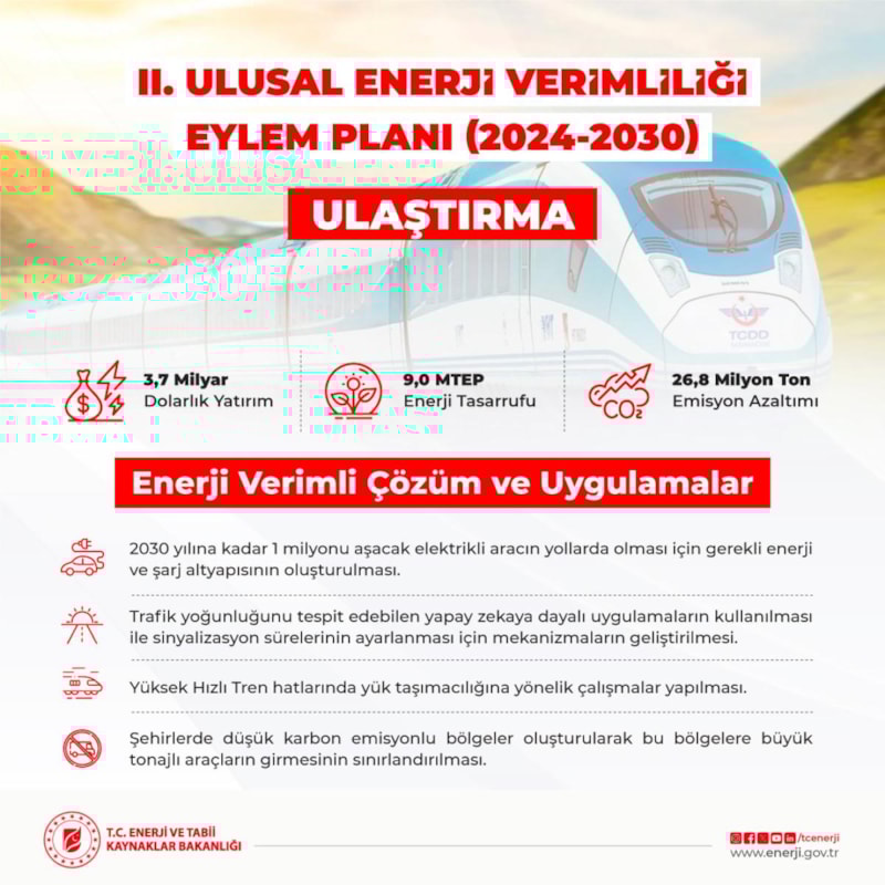 Enerji ve Tabii Kaynaklar Bakanlığı, II. Ulusal Enerji Verimliliği Eylem Planı ile ulaştırma sektöründe enerji verimli çözüm ve uygulamalara öncelik verileceğini açıkladı. Planlanan enerji verimliliği çözüm konuları da paylaşıldı.