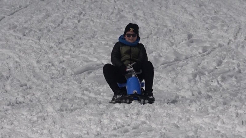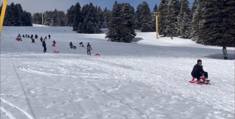 Yoğunluk beklenen hafta sonlarında bile ziyaretçi sayısının düşük olması nedeniyle kayak pistlerinde sessizlik hakim. Kayakseverlerin yerini ise kızakla kayan çocuklar aldı.