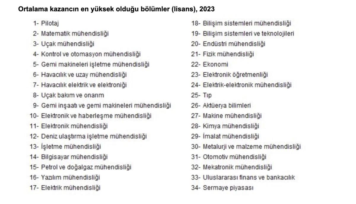 Lisans mezunlarının kazanç durumları incelendiğinde, aylık ortalama kazancı en yüksek olan beş bölüm sırasıyla; pilotaj, matematik mühendisliği, uçak mühendisliği, kontrol ve otomasyon mühendisliği, gemi makineleri işletme mühendisliği oldu.
