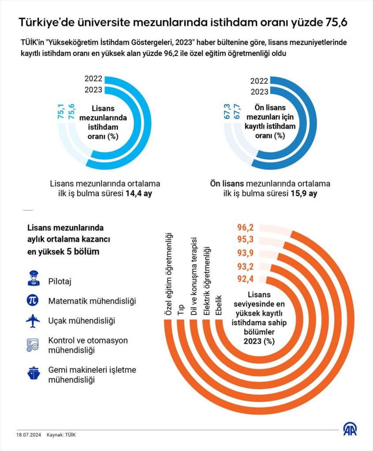Lisans seviyesinde en yüksek kayıtlı istihdama sahip olan bölümler özel eğitim öğretmenliği (yüzde 96,2), tıp (yüzde 95,3), dil ve konuşma terapisi (yüzde 93,9), elektrik öğretmenliği (yüzde 93,2) ile ebelik (yüzde 92,4) oldu.
