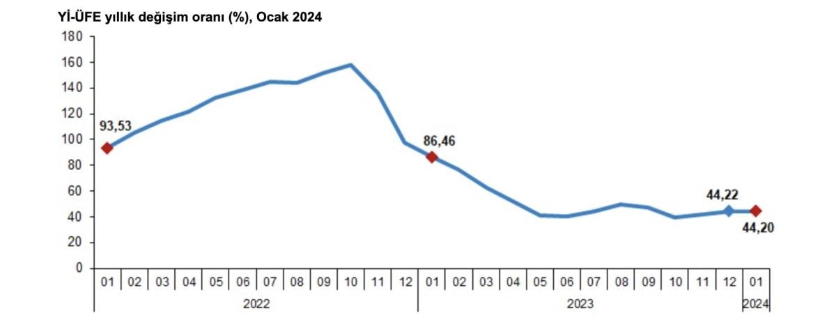 Yİ-ÜFE 2024 yılı Ocak ayında, bir önceki aya göre yüzde 4,14, bir önceki yılın aralık ayına göre yüzde 4,14, bir önceki yılın aynı ayına göre yüzde 44,20 ve 12 aylık ortalamalara göre yüzde 47,35 artış gösterdi.